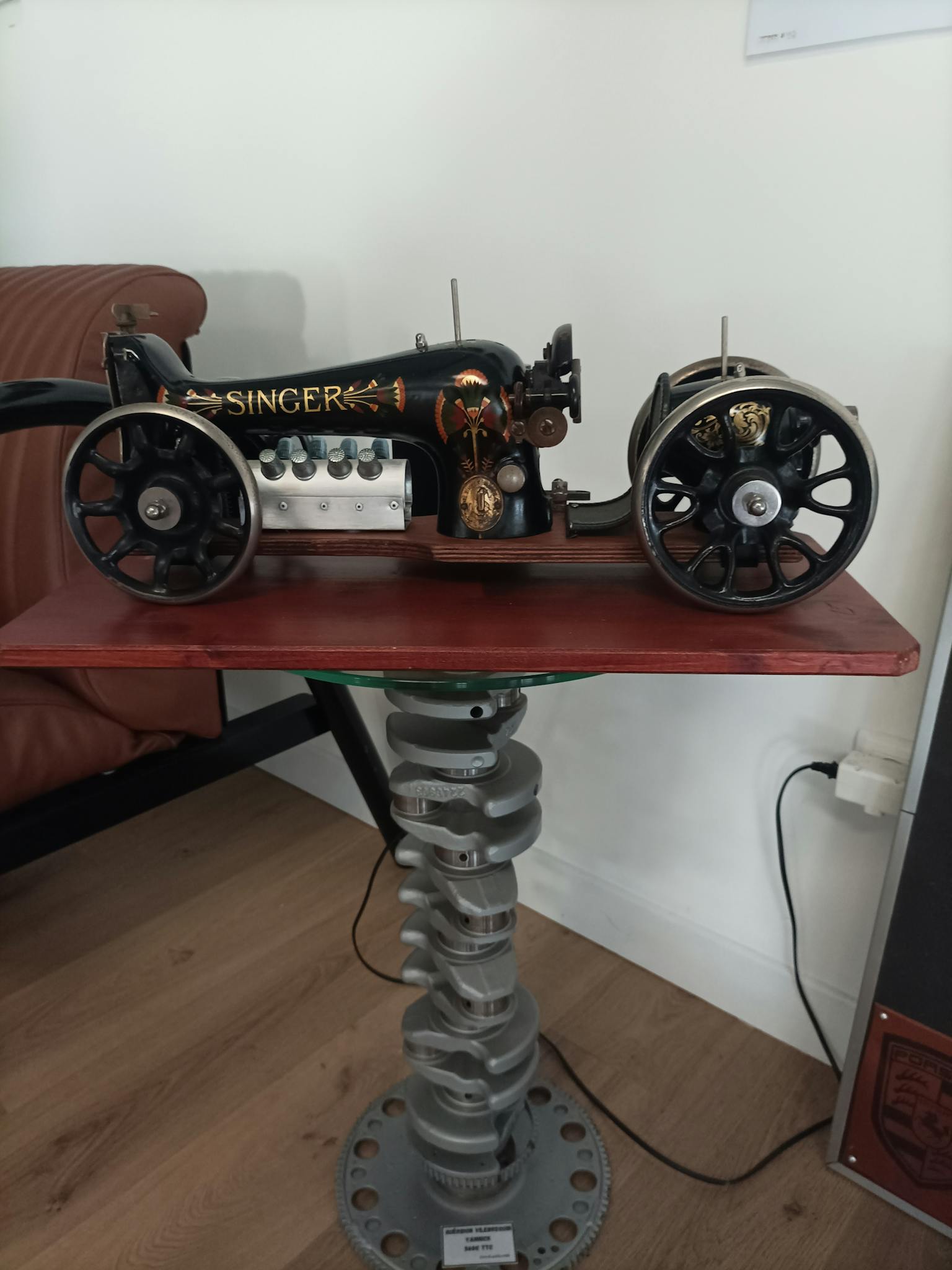 CommanderPièce unique, réalisation d'une automobile de course avec des éléments d'une machine à coudre d'époque singer. Une réalisation unique autour de la couture pour une pièce automobile Haute couture . Plus de photos sur demande . dimension L 60 / l 30 poids environ 8 kg