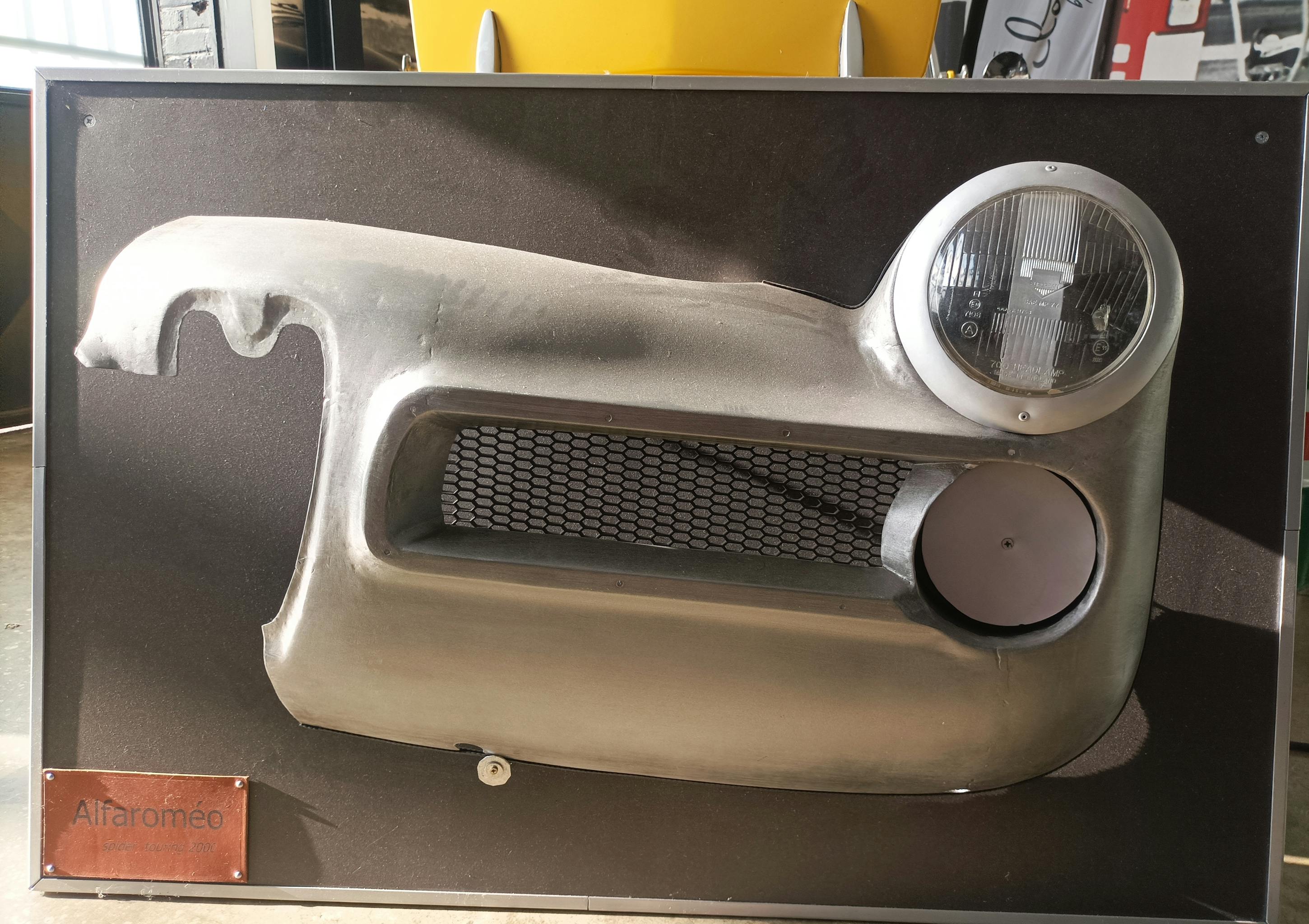 CommanderUn hommage exceptionnel à cette marque mythique Italienne et du modèle Spider Touring Spider . Véritable pièce d'époque aluminium encadré avec élégance et mise a blanc afin d'en ressortir ses volumes et matière . Pièce unique . L 122 l 82 Poids environ 8 kg